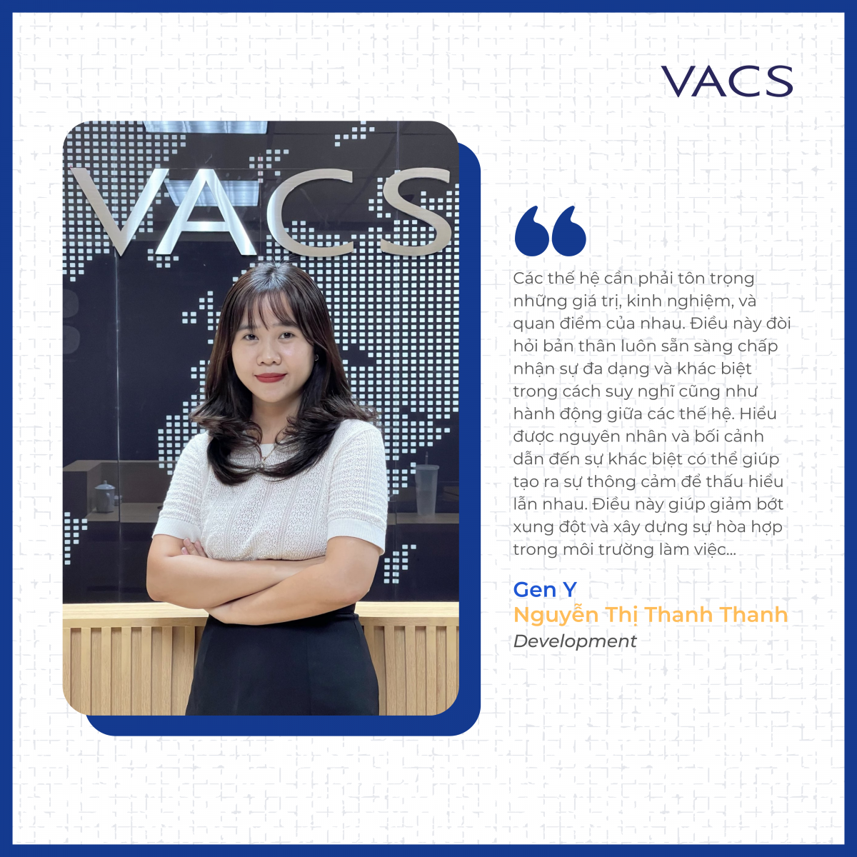 Là thế hệ chứng kiến nhiều sự biến chuyển quan trọng của thời đại, điều đặc trưng nhất về Gen Y theo chị Thanh Thanh cảm nhận là sự cởi mở, thích ứng tốt với những điểm mới và biết trân trọng những sự khác biệt trong xã hội. Qua quá trình làm việc tại VACS, chị Thanh chia sẻ: “Điều mình ấn tượng nhất khi làm việc ở môi trường VACS chính là môi trường rất nhiều người trẻ tài giỏi năng động, nhiệt huyết và sáng tạo. Được làm việc cùng những người giỏi đã giúp mình học hỏi được rất nhiều. Bên cạnh đó môi trường VACS có một tinh thần làm việc đội nhóm rất mạnh mẽ, mọi người luôn hỗ trợ lẫn nhau để hoàn thành tốt các công việc được giao.”