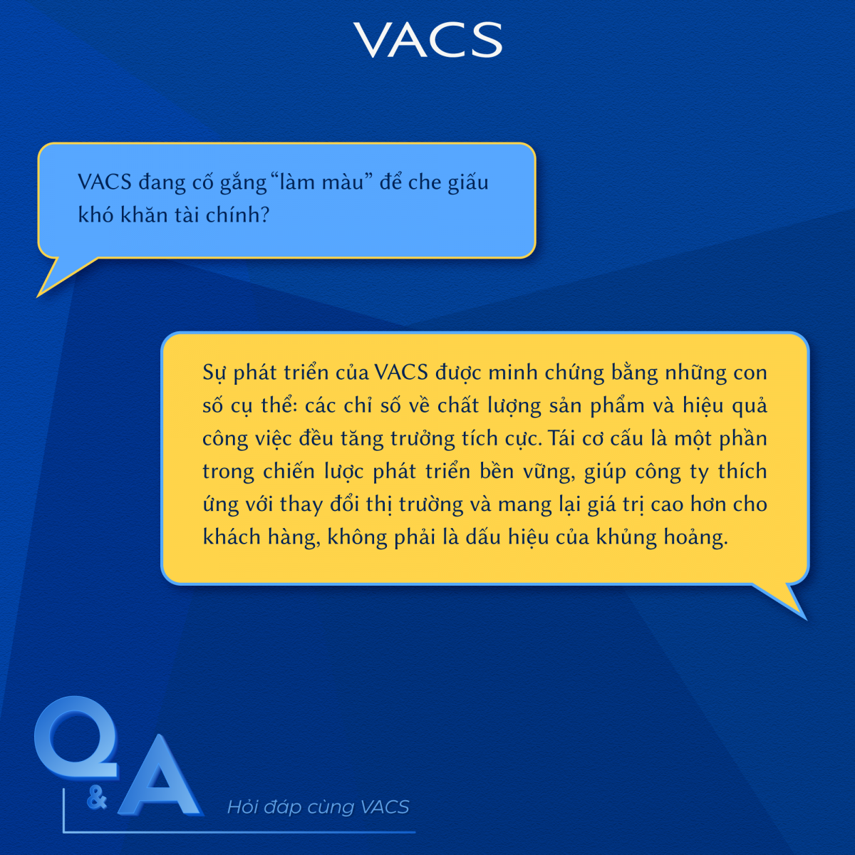 Tái cơ cấu là bước đi cần thiết để VACS tối ưu hóa hoạt động, giảm tải công việc không cần thiết và tạo dựng một môi trường làm việc hiệu quả hơn. Thông qua bộ Q&A này, VACS mong muốn được giải đáp những băn khoăn xoay quanh quá trình tái cơ cấu một cách rõ ràng, minh bạch. Hành trình đổi mới chắc chắn không dễ dàng, nhưng sự ủng hộ và cái nhìn khách quan của bạn sẽ là động lực để VACS tiếp tục tiến bước.