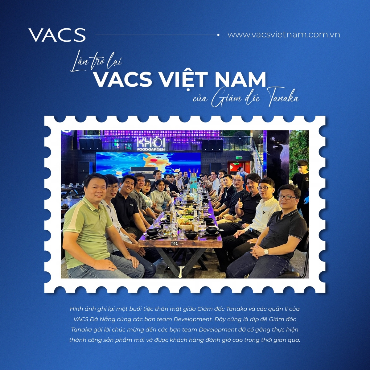 Vừa qua, VACS Việt Nam rất hân hạnh được tiếp đón Giám đốc Tanaka (VACS Japan), đến thăm và làm việc tại văn phòng Đà Nẵng. Nhân dịp này, Giám đốc Tanaka đã tổ chức một buổi tiệc thân mật cùng các quản lý VACS Việt Nam và các thành viên của bộ phận Development.