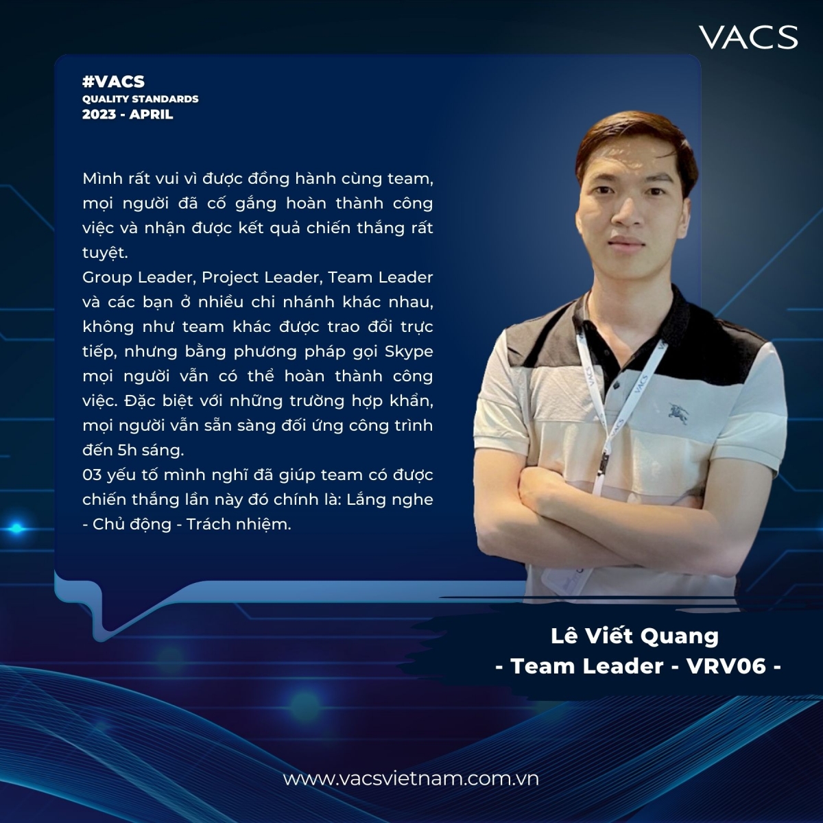 Team GL Thanh Tường - PL Nhật Anh - TL Viết Quang đã trở thành quán quân của sự kiện VACS Quality Standards Tháng 4.