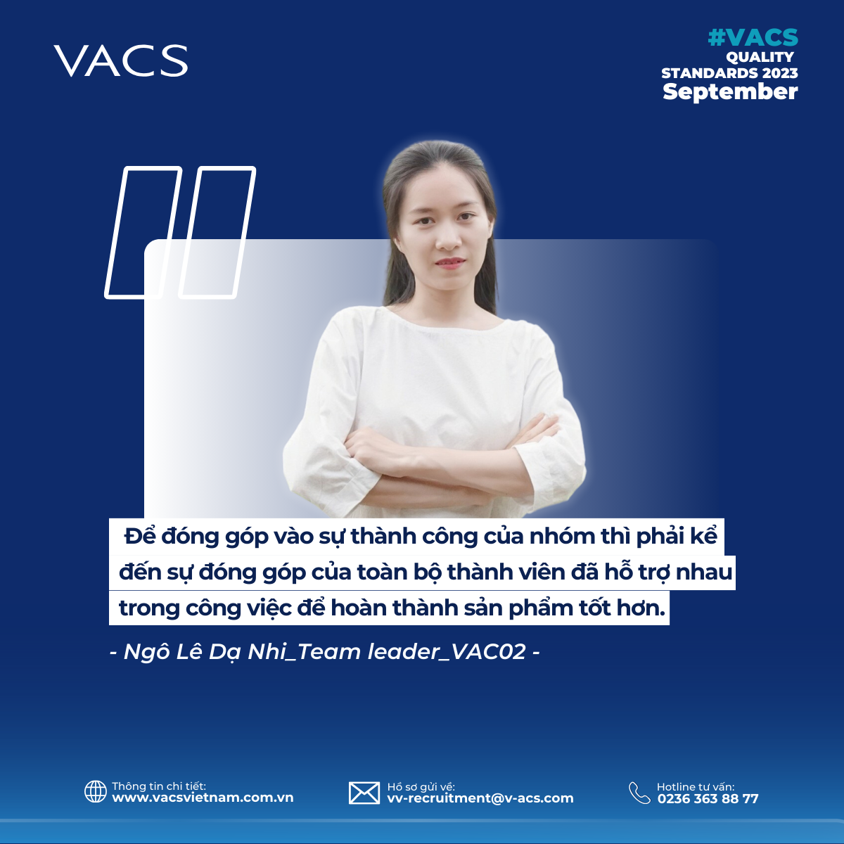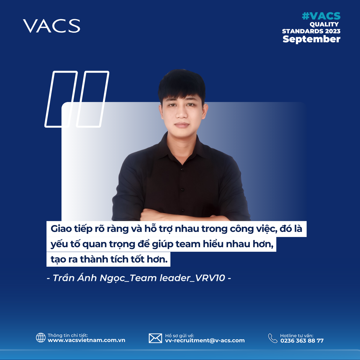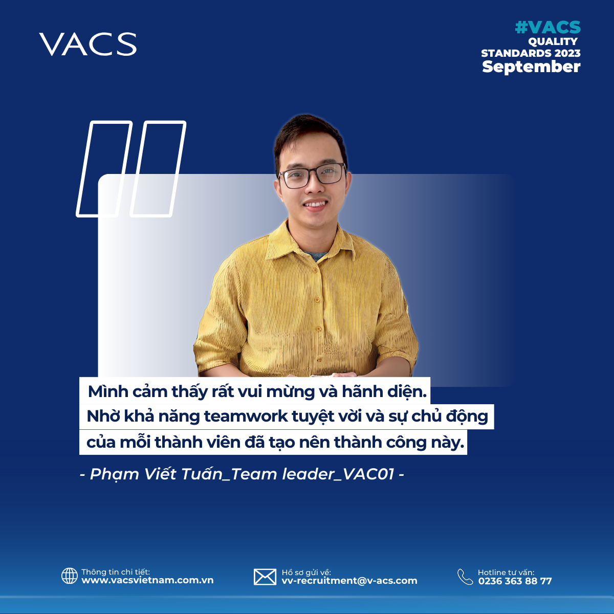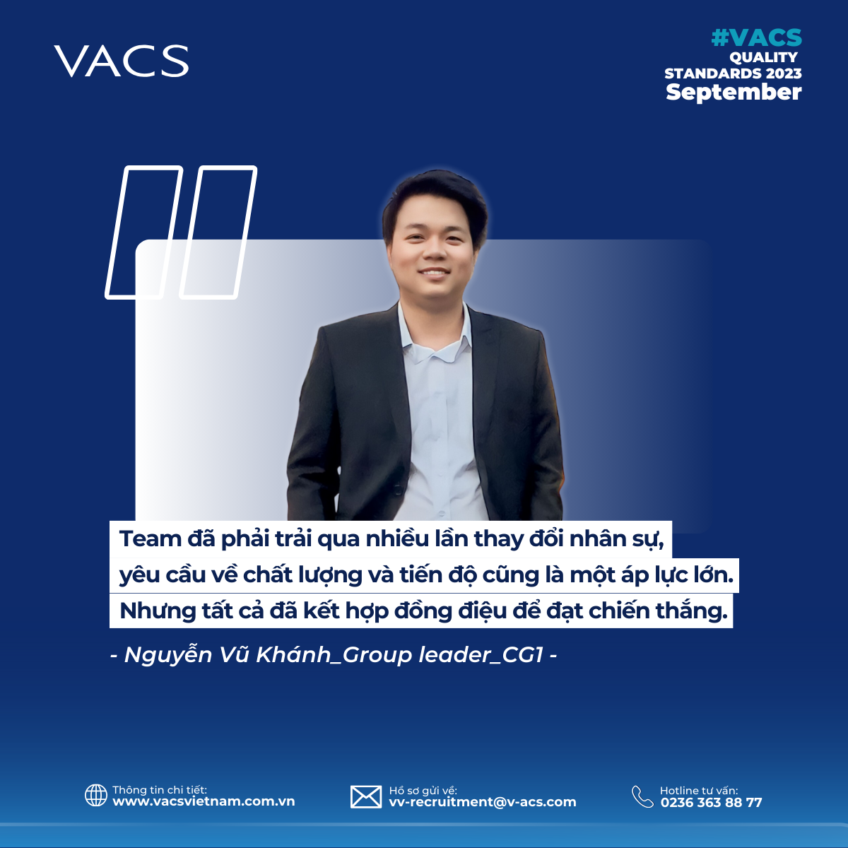 Cuối cùng, đến với những chia sẻ của TL. Nguyễn Văn Hoàng: "Quá tuyệt vời, vị trí Quán quân giải thưởng VACS Quality Standards tháng 9 đã quay trở lại với nhóm CG1, mình thực sự rất vui và tự hào về thành tích và sự cố gắng của cả nhóm. Mình nghĩ yếu tố quan trọng nhất để cả nhóm đạt được chiến thắng chính là: