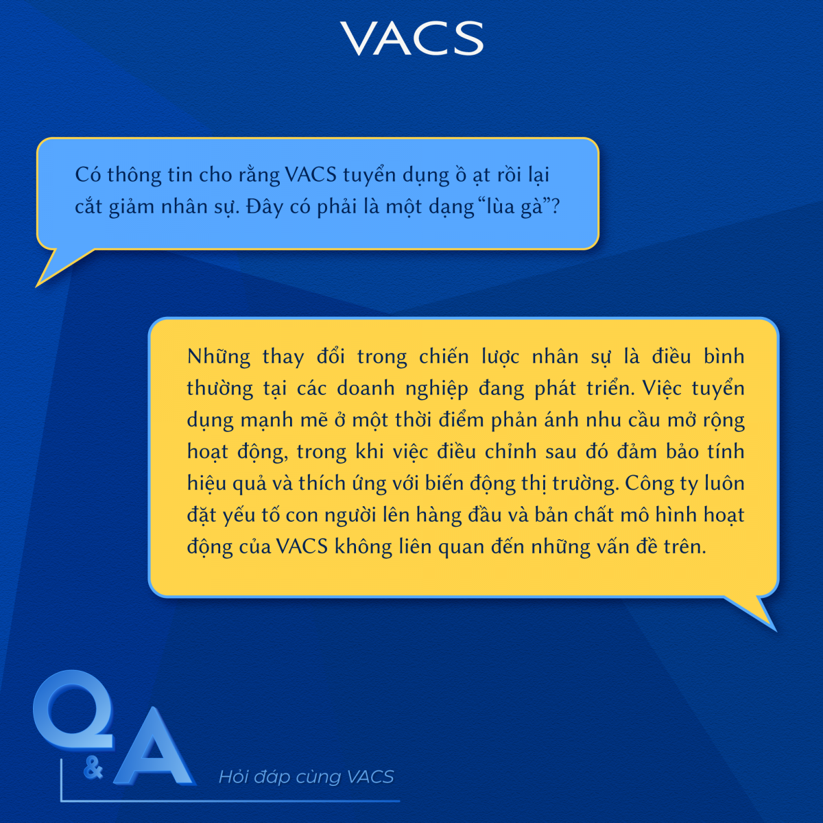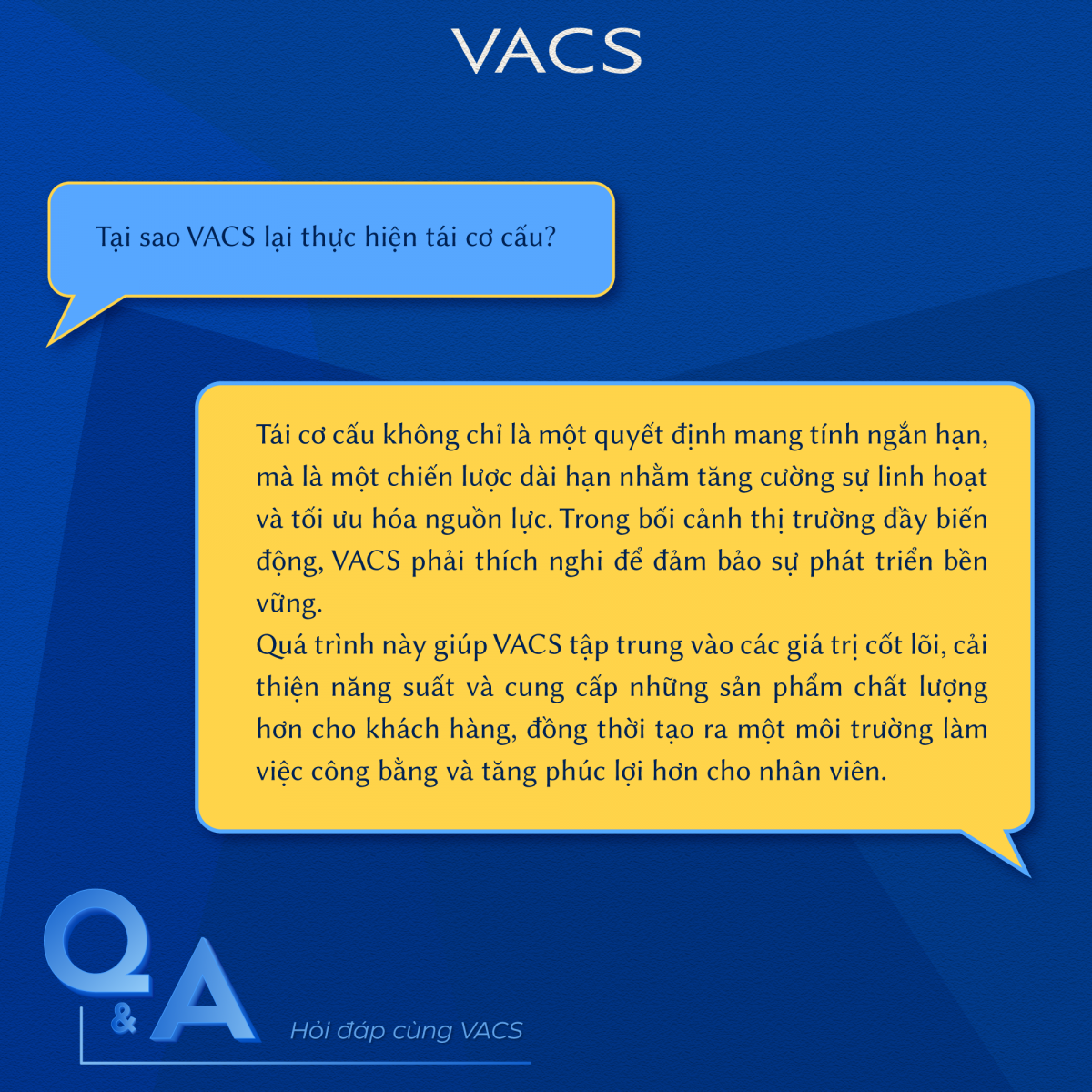 Tái cơ cấu là bước đi cần thiết để VACS tối ưu hóa hoạt động, giảm tải công việc không cần thiết và tạo dựng một môi trường làm việc hiệu quả hơn. Thông qua bộ Q&A này, VACS mong muốn được giải đáp những băn khoăn xoay quanh quá trình tái cơ cấu một cách rõ ràng, minh bạch. Hành trình đổi mới chắc chắn không dễ dàng, nhưng sự ủng hộ và cái nhìn khách quan của bạn sẽ là động lực để VACS tiếp tục tiến bước.