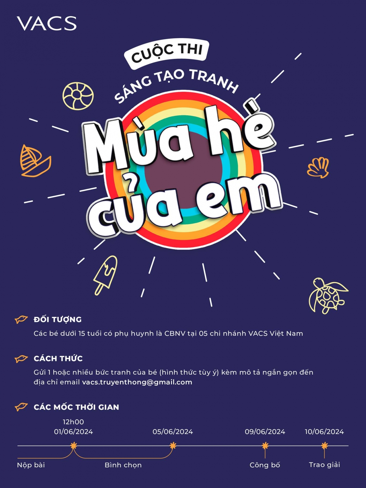 Trong gia đình lớn VACS Việt Nam, có nhiều mầm non nhỏ đang là niềm tin, lẽ sống và tương lai mà chúng ta hướng đến. Ngày Quốc tế Thiếu nhi đến gần, ngoài những món quà ý nghĩa sẽ được bật mí trong thời gian tới, Cuộc thi sáng tạo tranh với chủ đề "Mùa hè của em" được VACS tổ chức nhằm tạo nên sân chơi bổ ích, giúp các con thể hiện tài năng hội họa, năng khiếu thẩm mỹ.