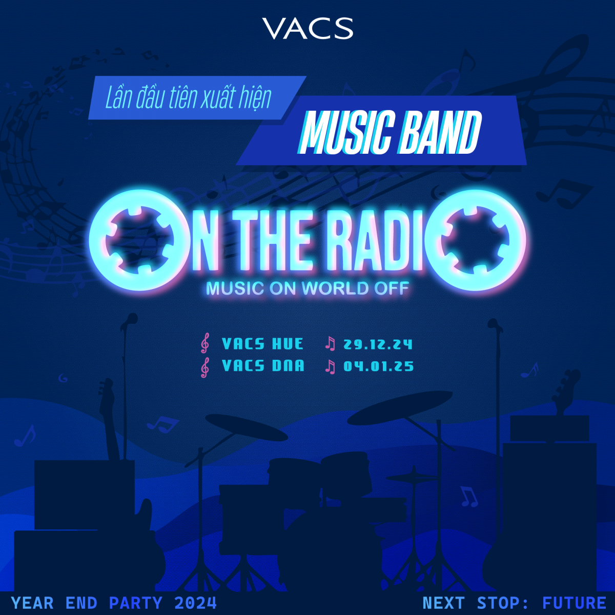 Năm nay, sân khấu YEP nhà VACS sẽ bùng nổ hơn bao giờ hết khi có sự góp mặt của các ban nhạc đình đám. Với phong cách biểu diễn đầy lôi cuốn và chuyên nghiệp, On The Radio Band sẽ mang đến những khoảnh khắc thăng hoa tại sự kiện Đà Nẵng, Huế. Còn tại TP.HCM, ban nhạc nào sẽ thắp lửa sân khấu, chạm đến cảm xúc của mỗi VACSer? Tất cả sẽ được hé lộ tại chương trình Year End Party - Next Stop: Future!