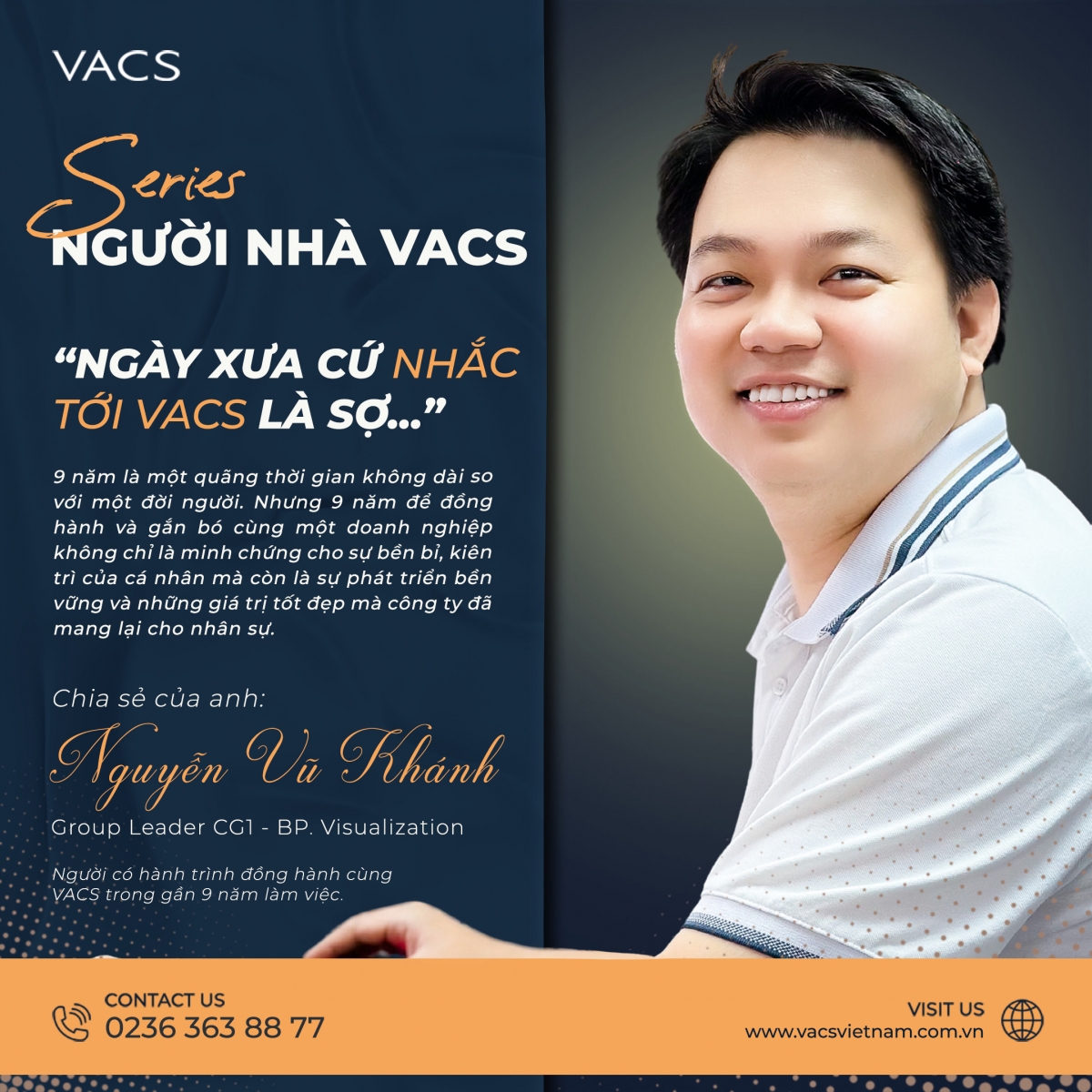9 năm - một quãng đường sự nghiệp phải nói là dài và nhiều chông gai. Đủ để người ta cảm nhận được những được - mất. Đủ để người ta thấy được những mặt phải - trái, tích cực - tiêu cực trong một môi trường. Tại sao VACS lại là nỗi sợ? Nỗi sợ ở đây liệu có kinh khủng như việc bạn đang xem một bộ phim kinh dị hay không? Hay nỗi sợ ở đây chỉ là từ góc nhìn chưa mấy khách quan và đang xuất phát từ chính nội tâm không vững vàng từ mỗi con người? Cùng tôi gặp gỡ anh Khánh - người đã đồng hành cùng VACS trong suốt 9 năm để lắng nghe hành trình mà anh đã trải nghiệm.