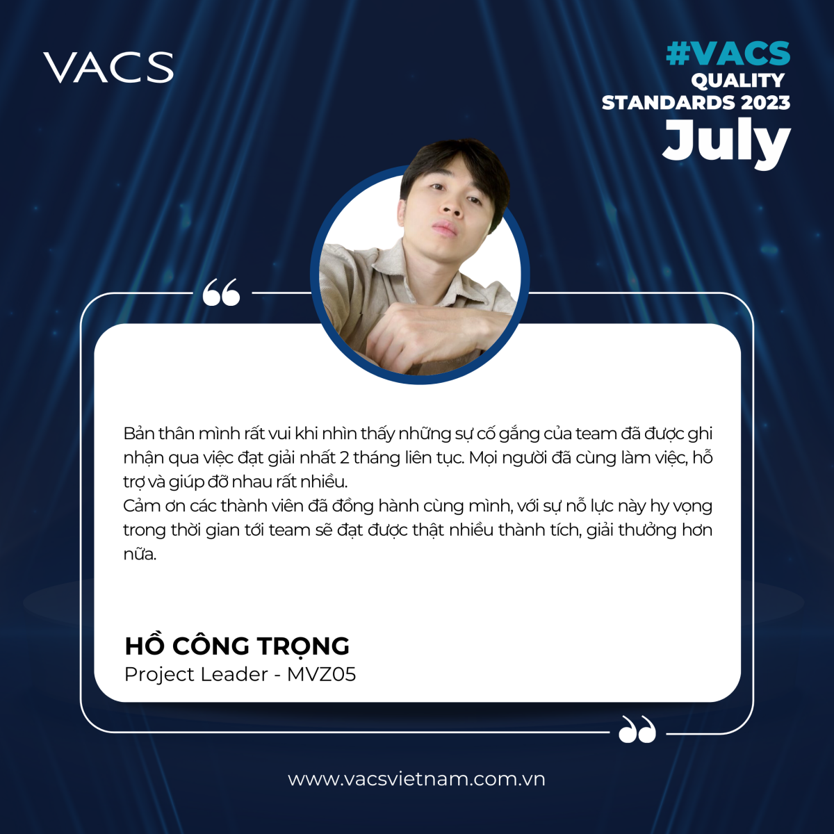 Mong rằng team sẽ tiếp tục phát huy những điểm mạnh, luôn duy trì tinh thần tốt và giữ vững phong độ để bảo vệ ngôi vị quán quân trên chặng đua sắp tới! Hãy luôn tin tưởng vào bản thân và đồng đội, vì các bạn là đội một nhóm tuyệt vời. VACS tự hào về các bạn.