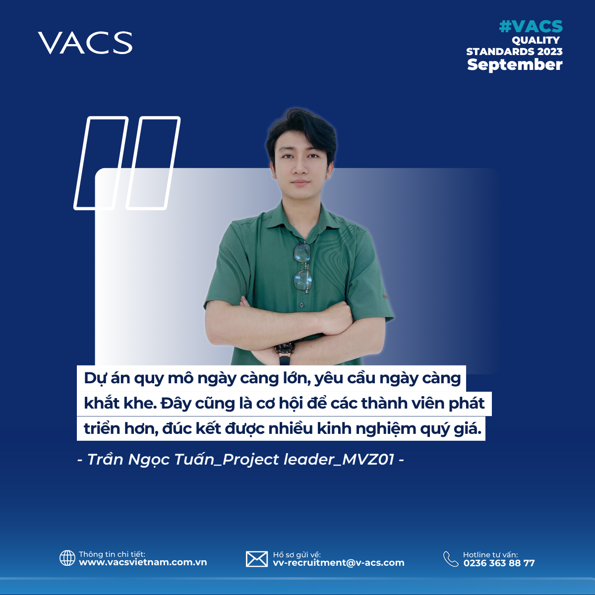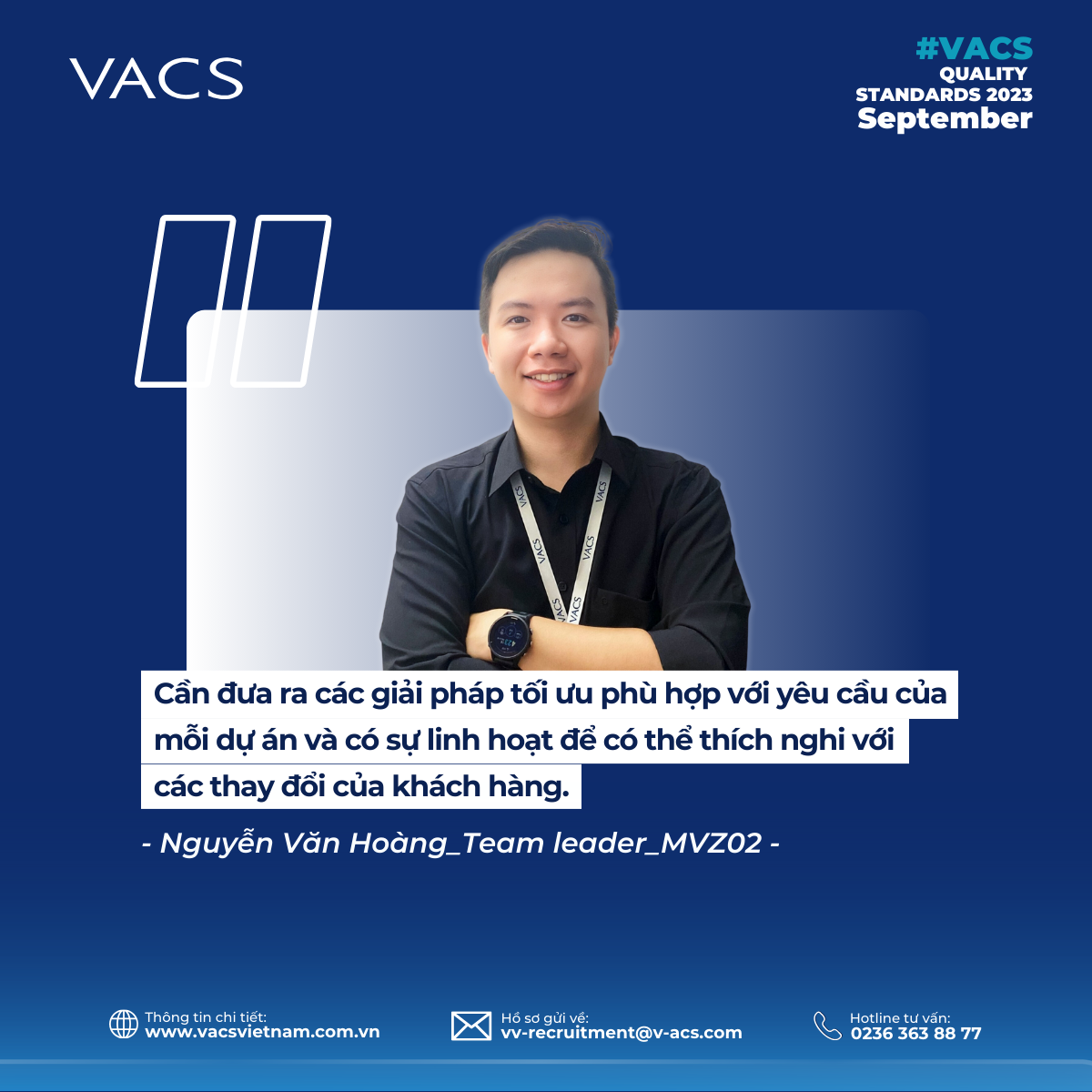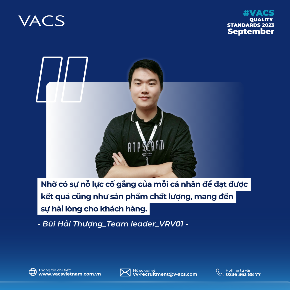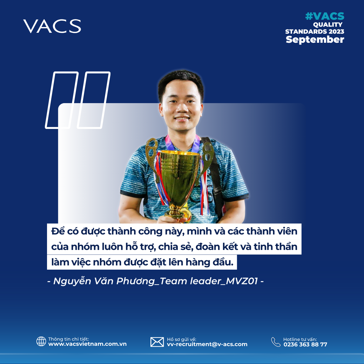 Cuối cùng, đến với những chia sẻ của TL. Nguyễn Văn Hoàng: "Quá tuyệt vời, vị trí Quán quân giải thưởng VACS Quality Standards tháng 9 đã quay trở lại với nhóm CG1, mình thực sự rất vui và tự hào về thành tích và sự cố gắng của cả nhóm. Mình nghĩ yếu tố quan trọng nhất để cả nhóm đạt được chiến thắng chính là: