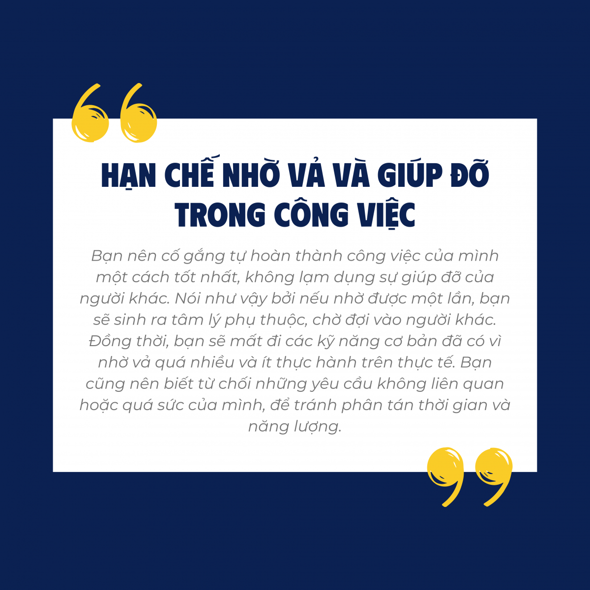 Nếu bạn thường xuyên chờ đợi sự chỉ đạo, không đưa ra ý kiến, không tìm kiếm cơ hội và không thay đổi để tiến bộ, bạn có thể bị xem là một người thụ động. Điều này không chỉ làm giảm khả năng được trọng dụng và thăng tiến, mà còn làm bạn mất đi sự tự tin và mạnh dạn trong cuộc sống. Đây là một tính cách tiêu cực cần loại bỏ để đảm bảo sự phát triển cho bản thân và môi trường làm việc.