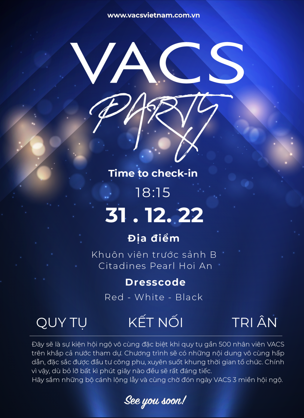 Nhằm đánh dấu những thành tựu của năm cũ, chào đón năm mới và giúp toàn thể nhân viên VACS có nhiều cơ hội để gần nhau hơn. Chương trình gala dinner cuối năm sẽ được tổ chức trong chuyến du lịch của công ty, được diễn ra trong không gian sang trọng, lãng mạn bậc nhất của Citadines Pearl Hoi An Resort.